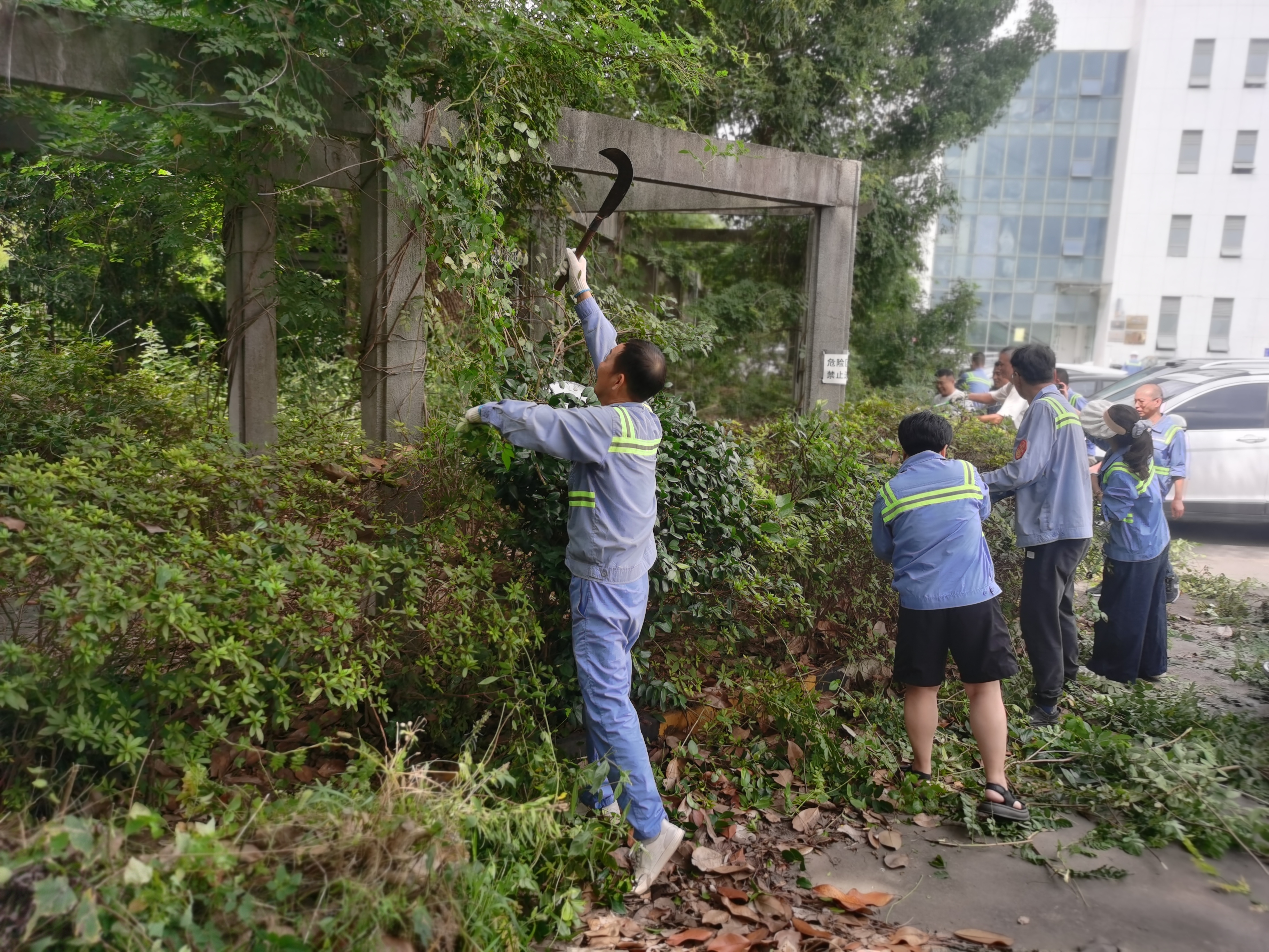 活动当天,志愿者们戴好纱布手套,携带园林修剪专业工具,准时奔赴各自责任区域。活动现场气氛热烈,秩序井然。大家分工明确,配合默契。有的手持专业剪刀,利落地修剪过高杂草;有的挥动锄头,仔细清理深扎的顽固草根;还有的成员则负责清理绿化带的垃圾并协同清运,将收集起来的枯枝败叶快速转运处理,确保作业面整洁。