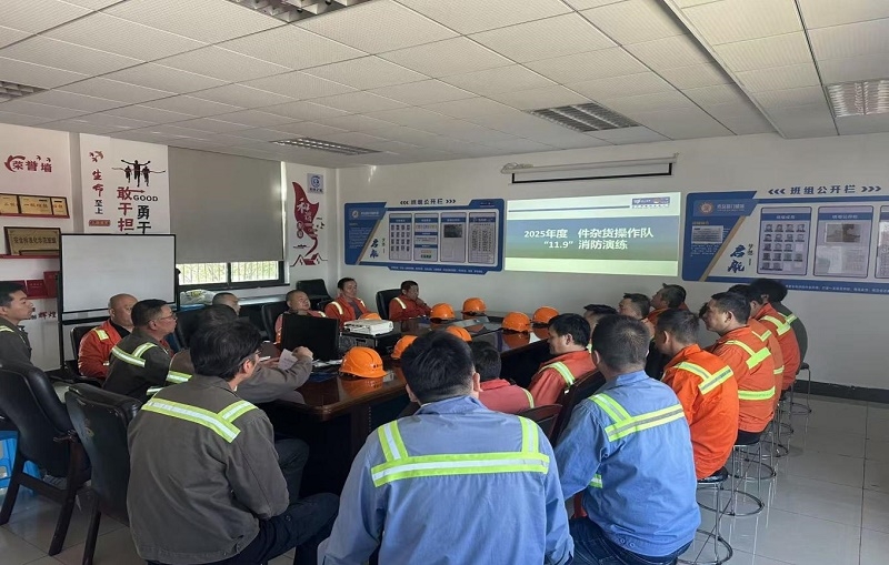 演练前,件杂货操作队队长主持召开专项部署会,明确演练流程与职责分工。同时,部门安全管理员向全体队员讲解了火灾预防、初期扑救、疏散逃生等基础知识,重点演示了干粉灭火器、消防栓的正确使用方法,并强调“黄金三分钟”的应急响应原则。
